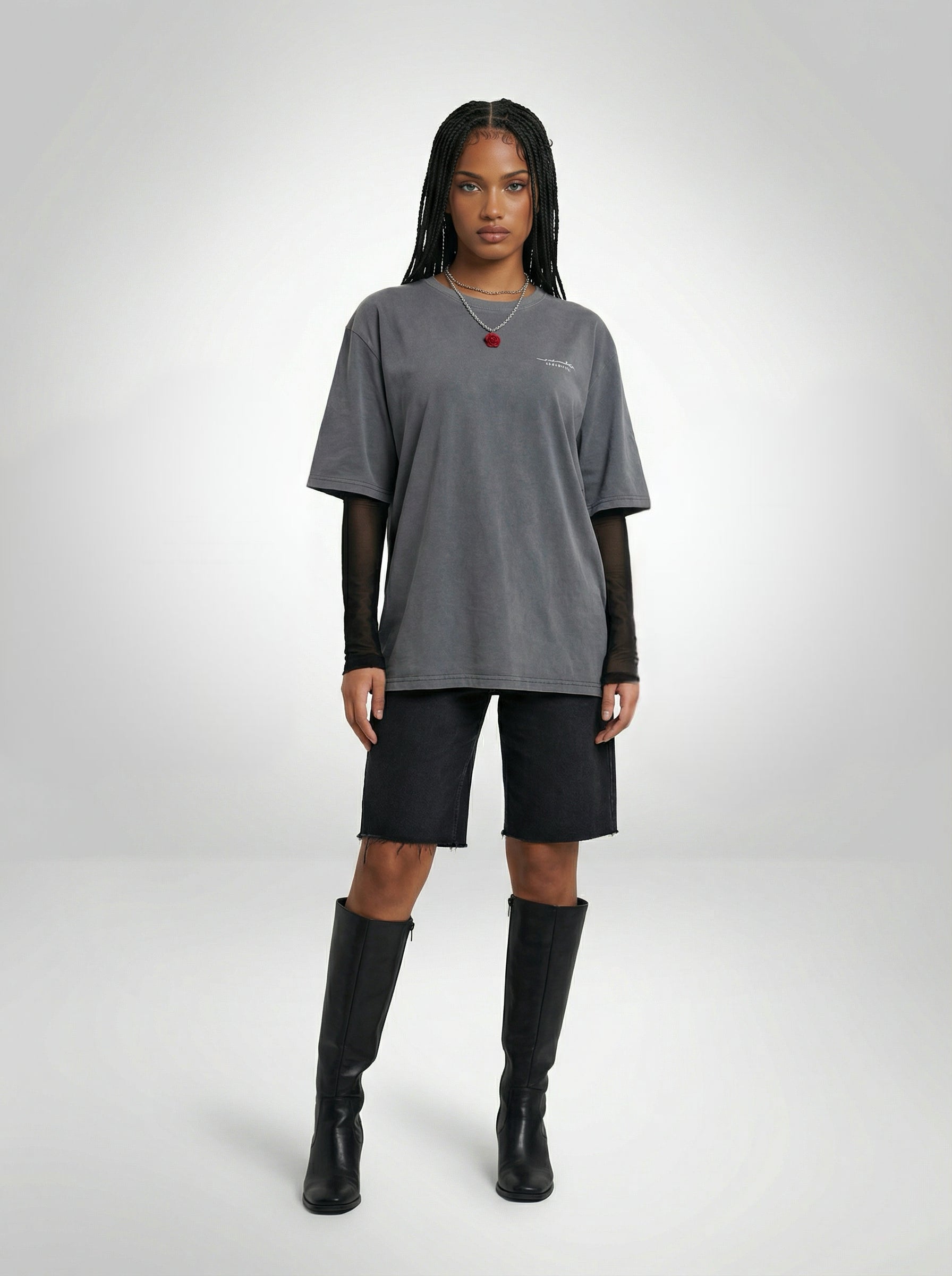 For Her: Layer theT-shirt over a long-sleeve sheer black top, styled with knee-length black denim shorts and boots, then add a statement necklace for a pop of color.