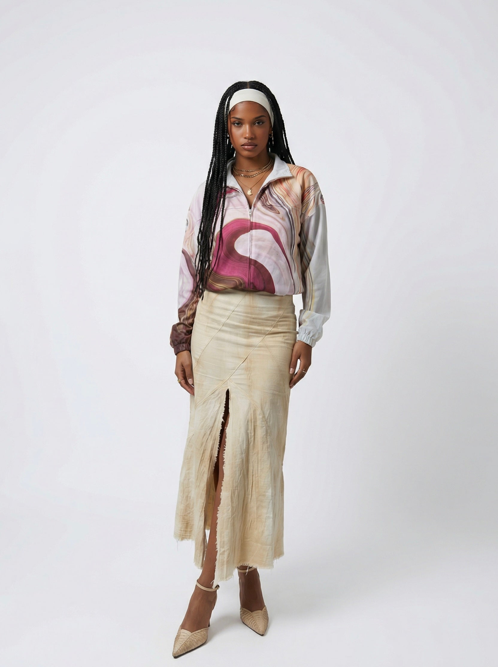 For Her: Style the windbreaker closed and slightly tucked with a fitted beige maxi skirt, an off-white headband, and beige pointed heels for a clean, structured look.