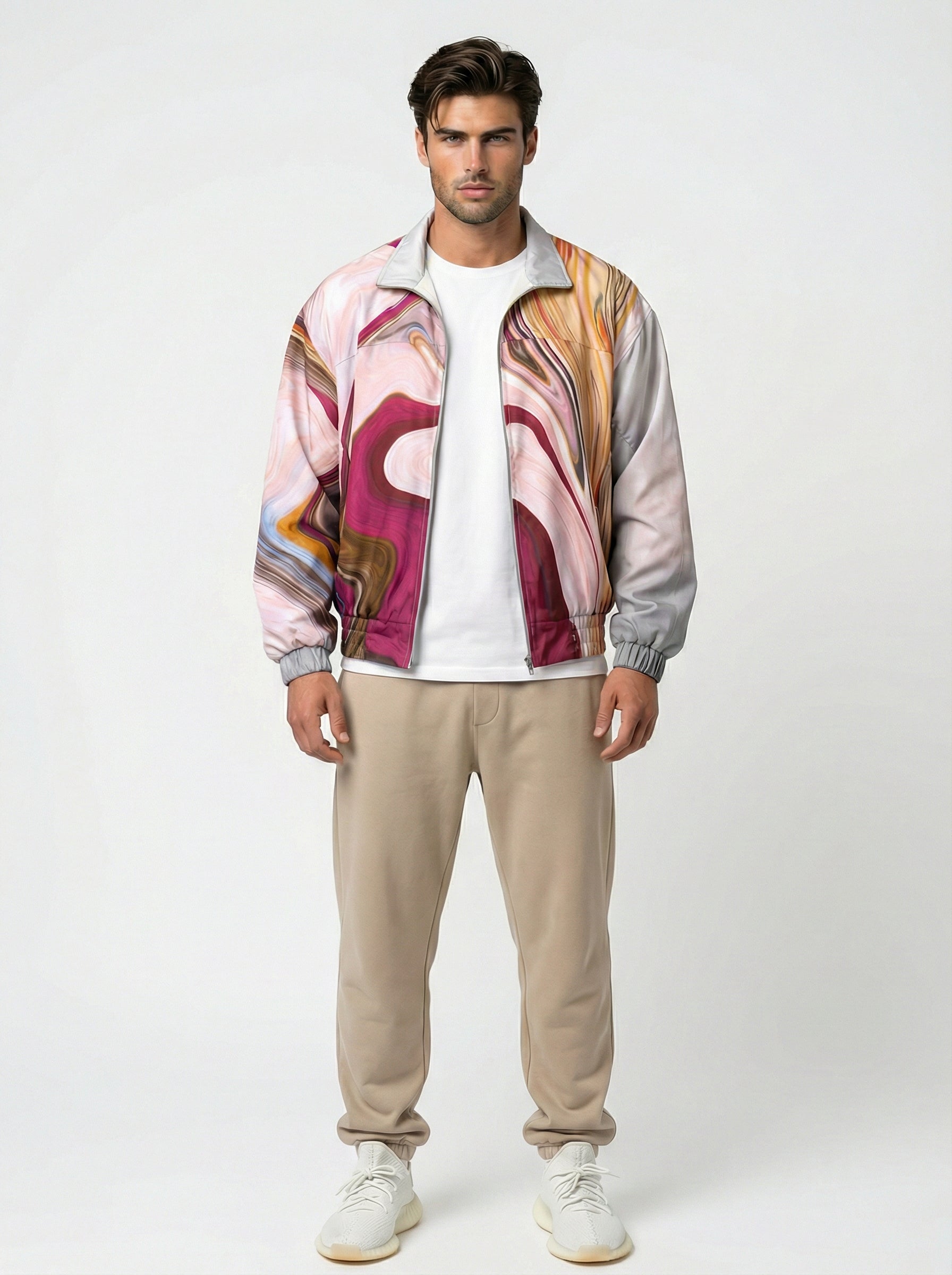 For Him: Style the jacket with a relaxed-fit white T-shirt ,beige sweatpants, and white sneakers for an easy, comfort-focused look.