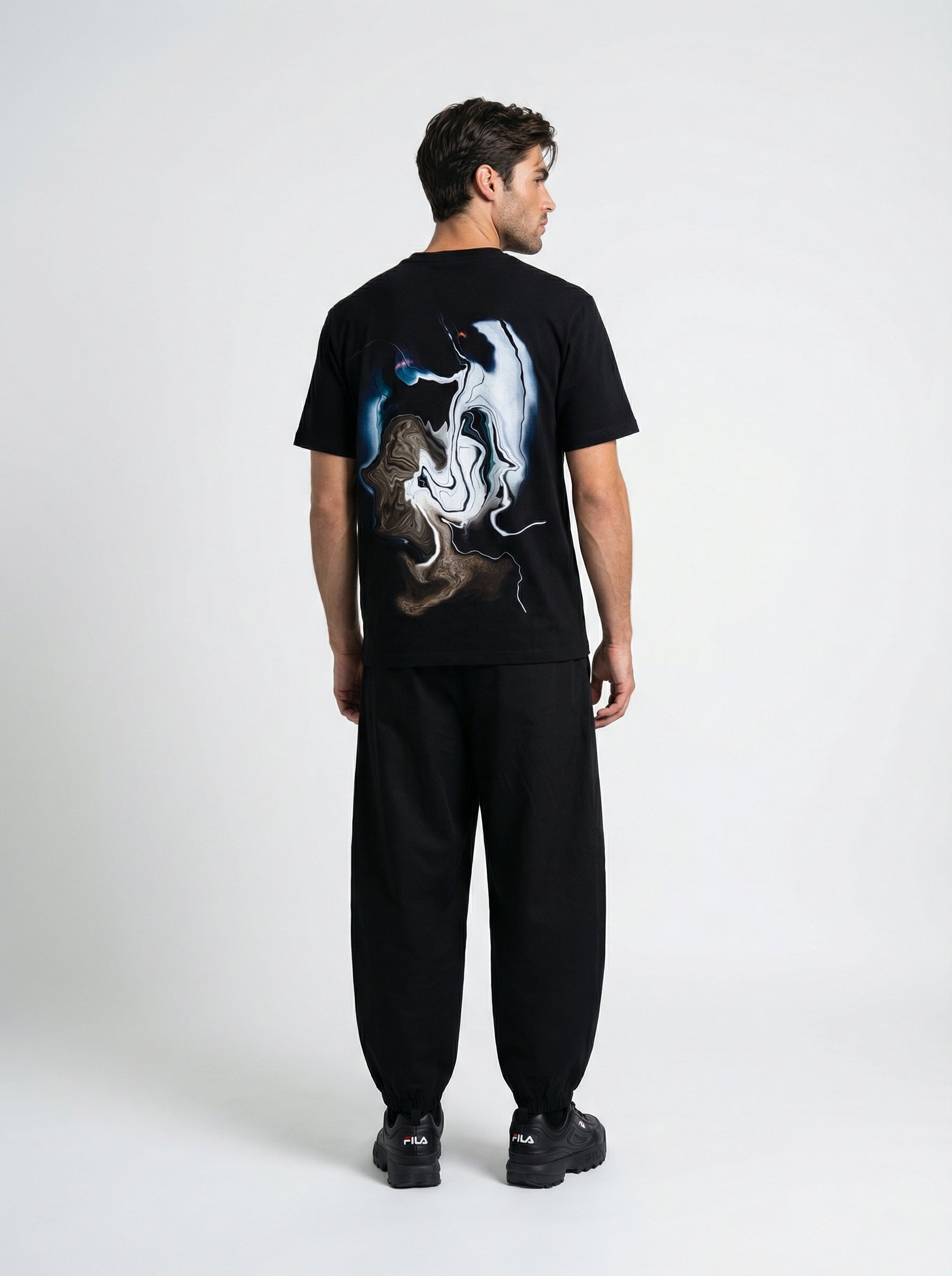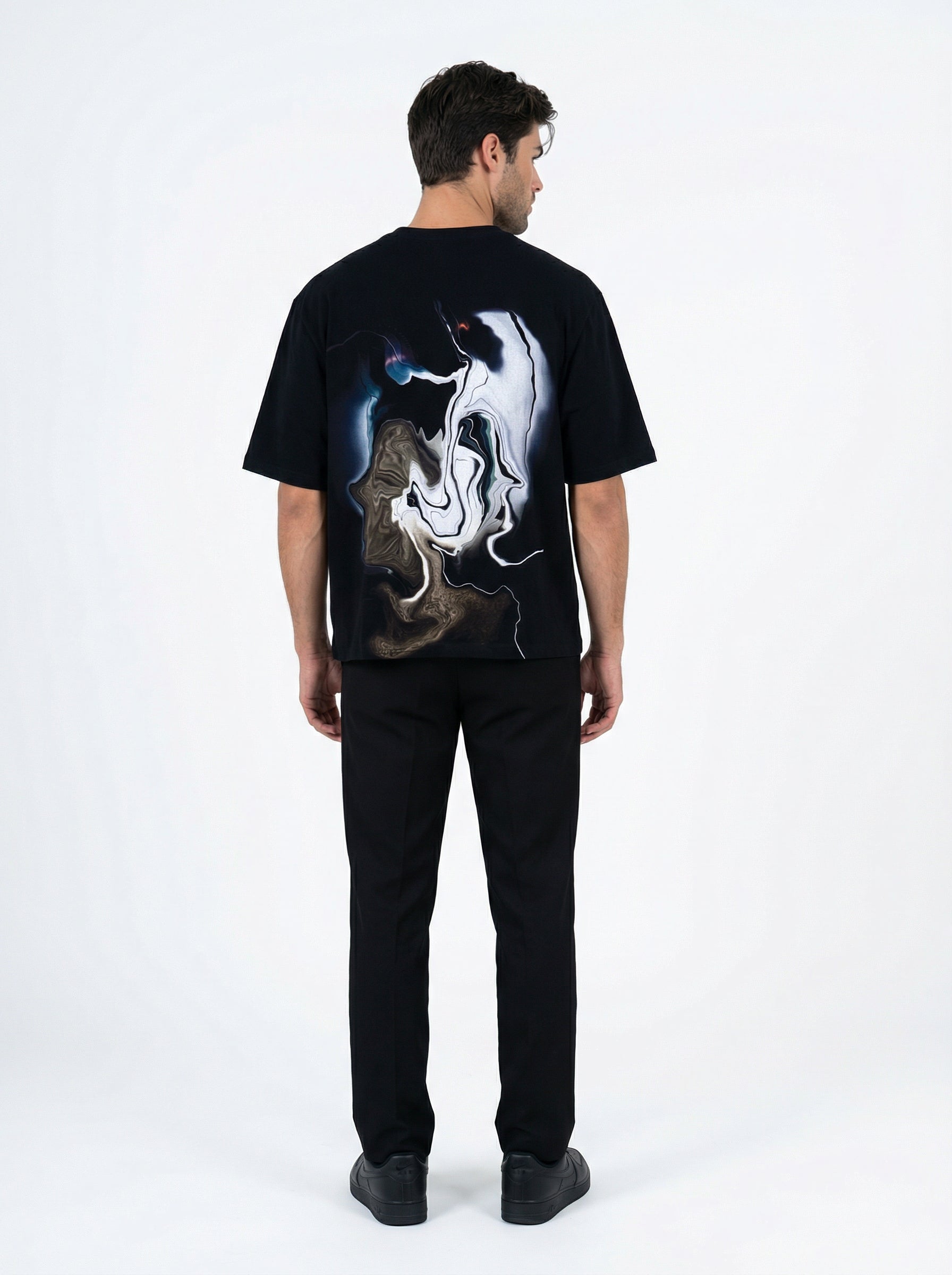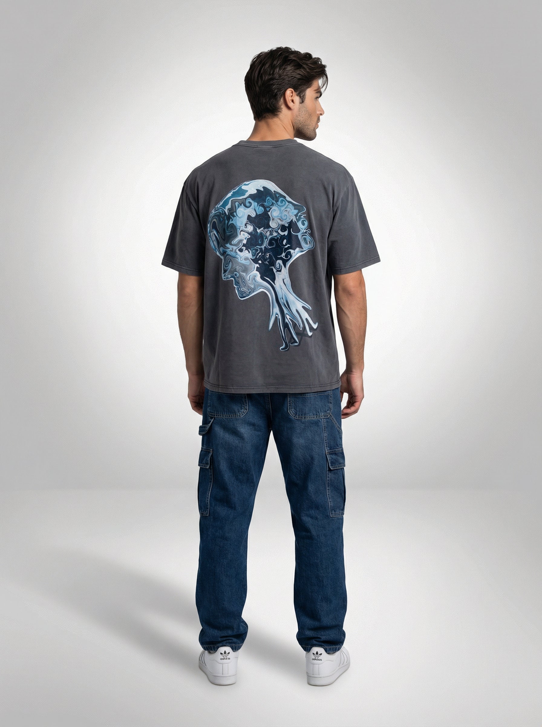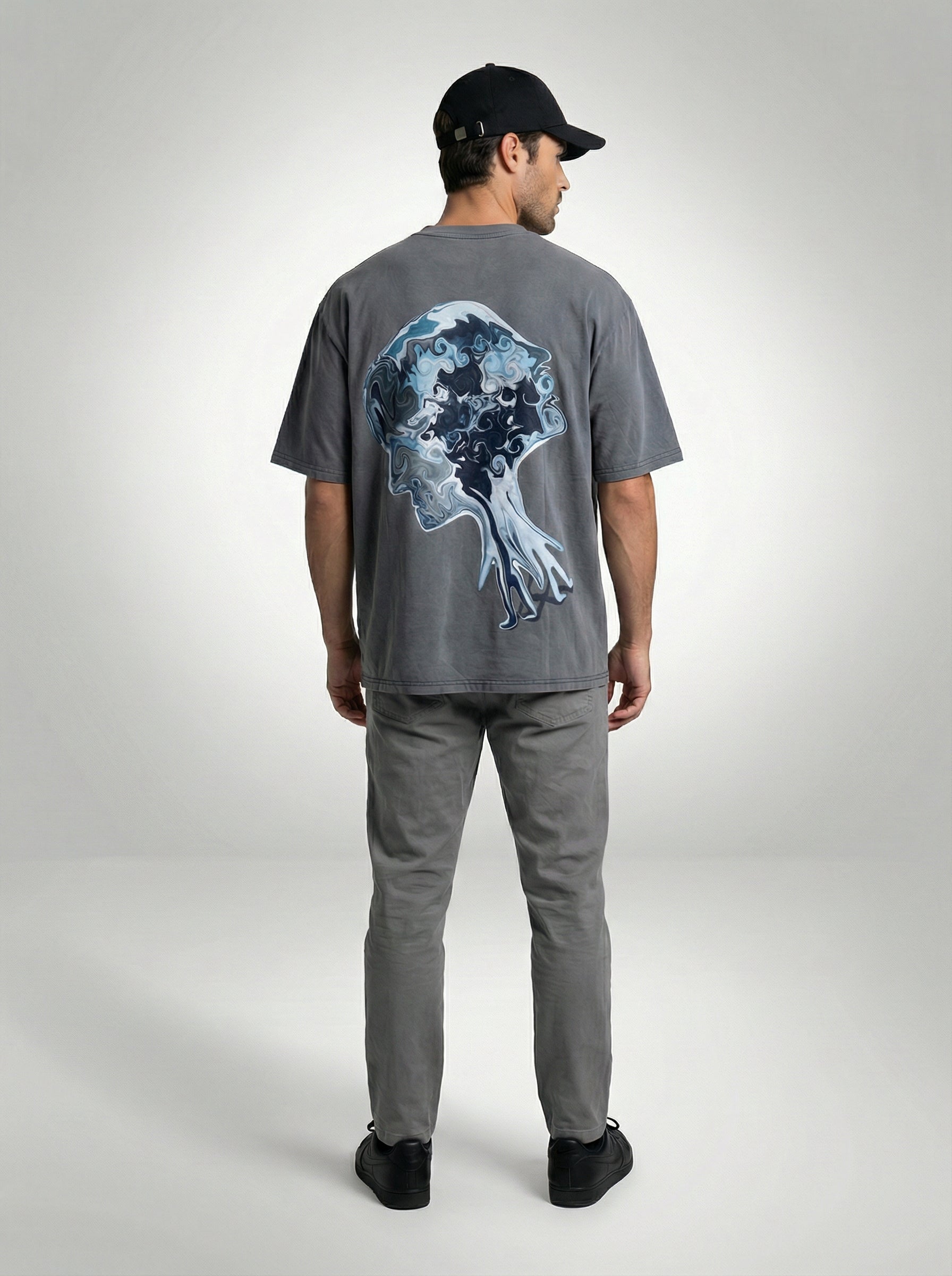 For Him: Style the Mindscape Flow tee with grey denim jeans, a black cap, and black shoes for a clean, monotone look with a confident edge.