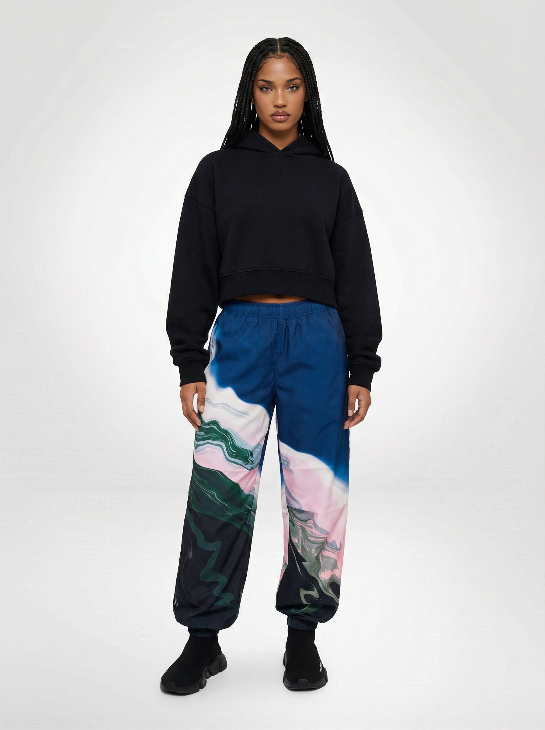 For Her: Style the cargo pants with a cropped oversized black hoodie and sock-style shoes for a balanced mix of comfort and street-ready style.