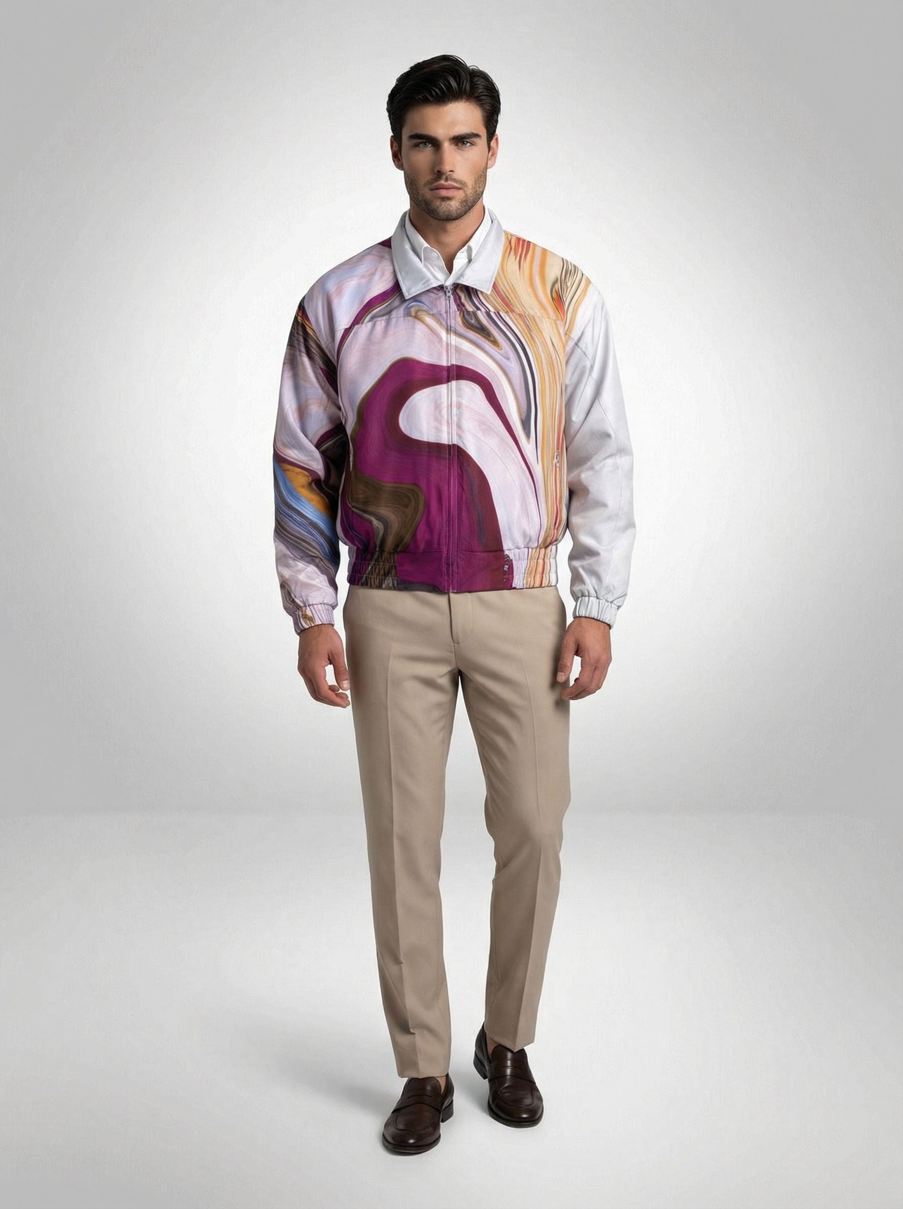 For Him: Layer the jacket over a white formal button-down shirt, paired with beige trousers and brown loafers for a modern, polished look.