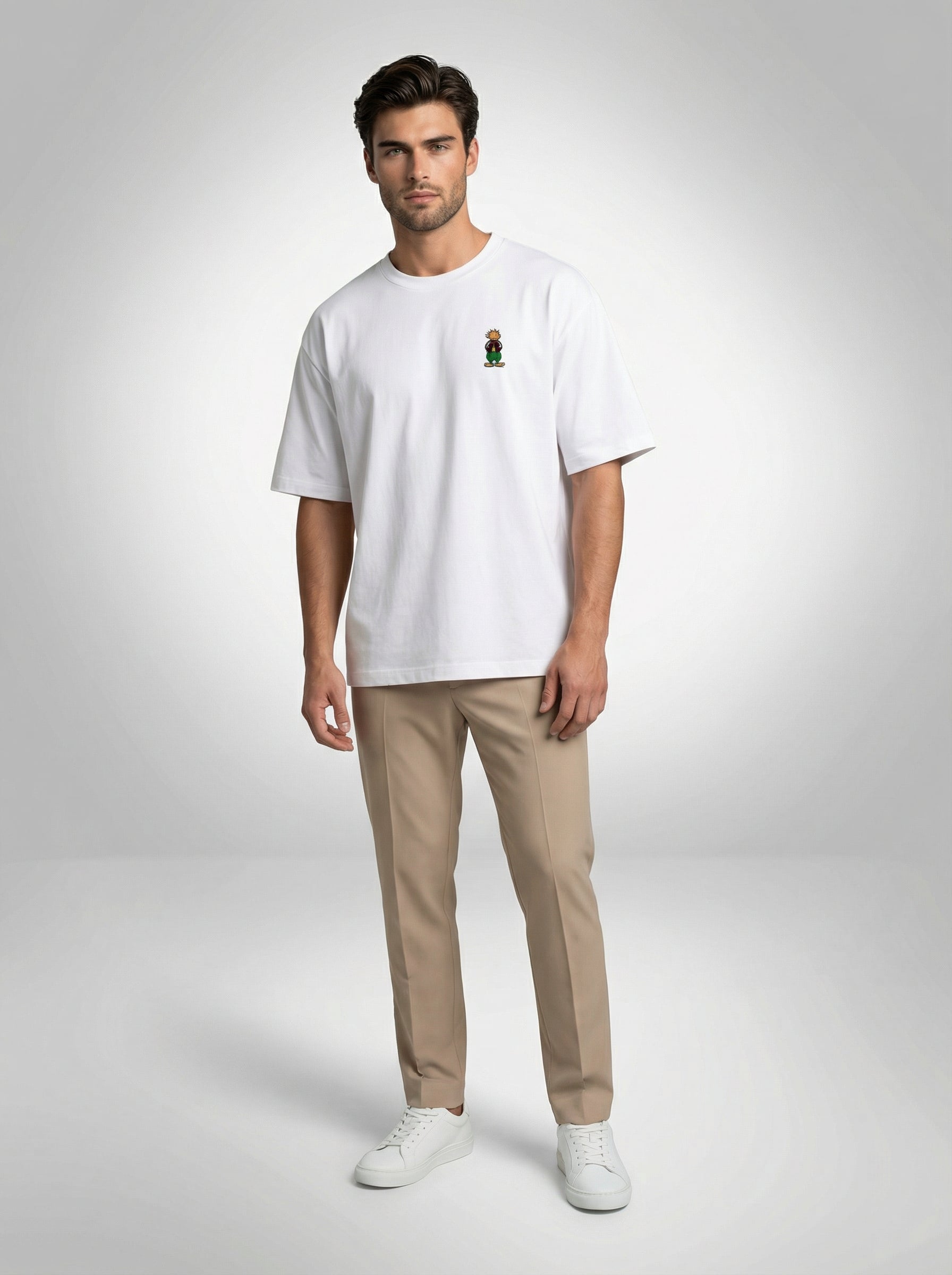 For Him: Style the Handala T-shirt with beige pants and white sneakers for a clean, chic monotone look.