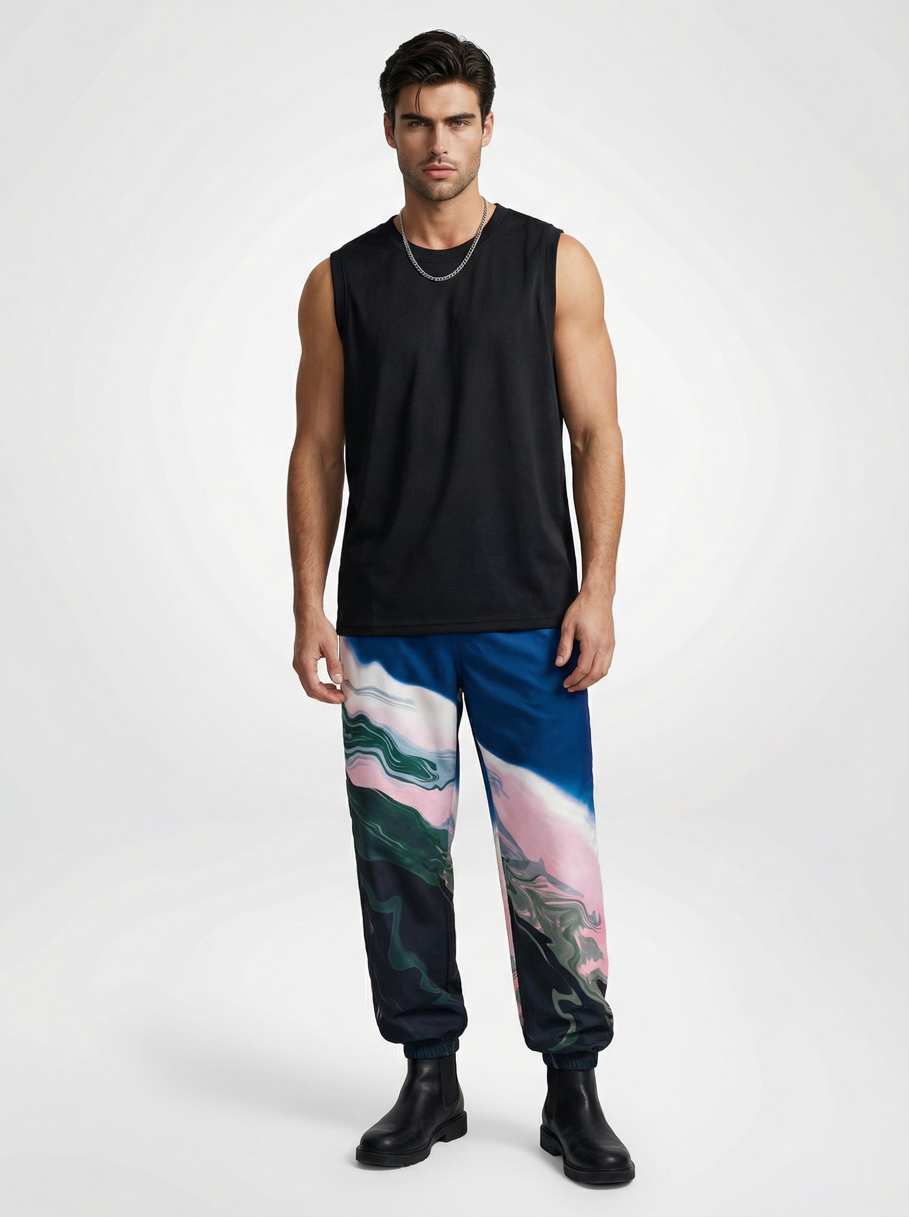 For Him: Style the cargo pants with a sleeveless black basketball shirt and short black boots for a bold, edgy look with a festive edge.