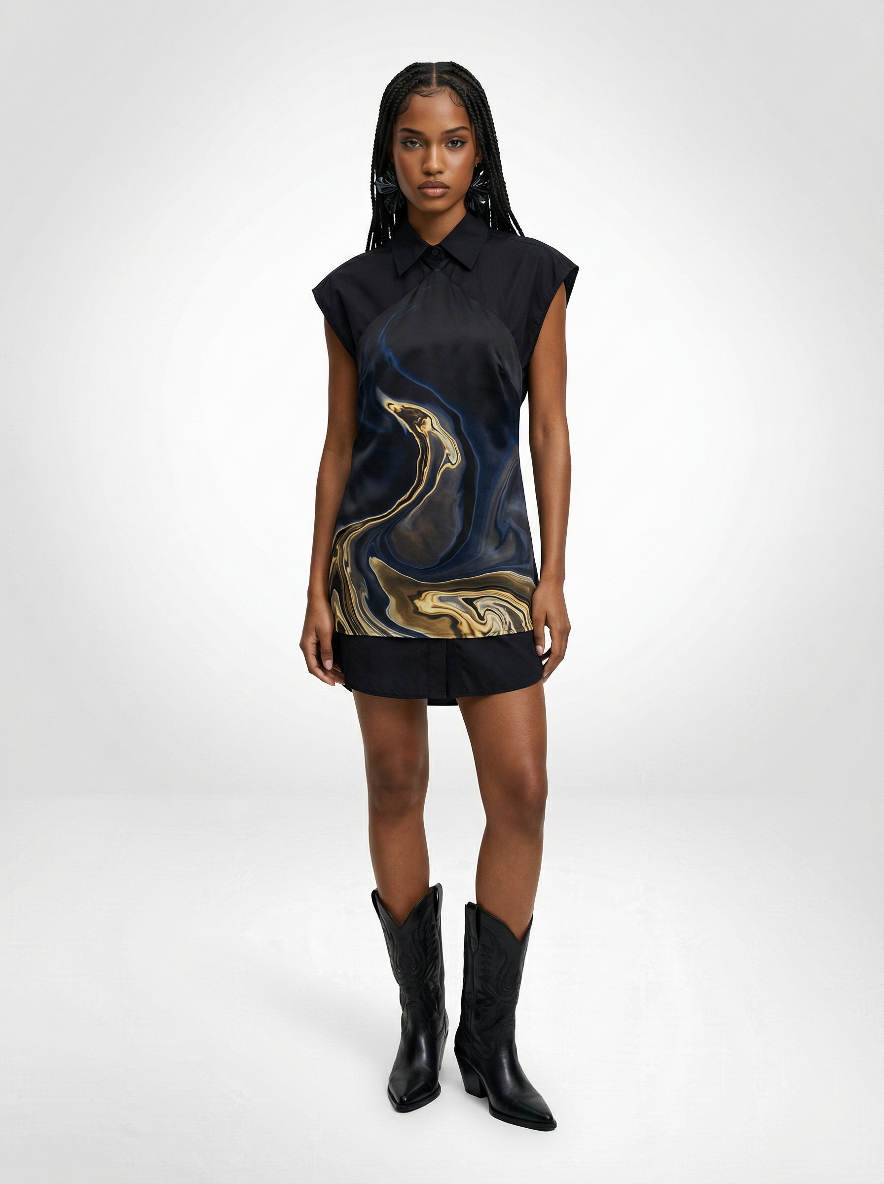 For Her: Layer the dress over a sleeveless black button-up shirt, finished with cowboy boots for a bold, styled look with a Western edge.
