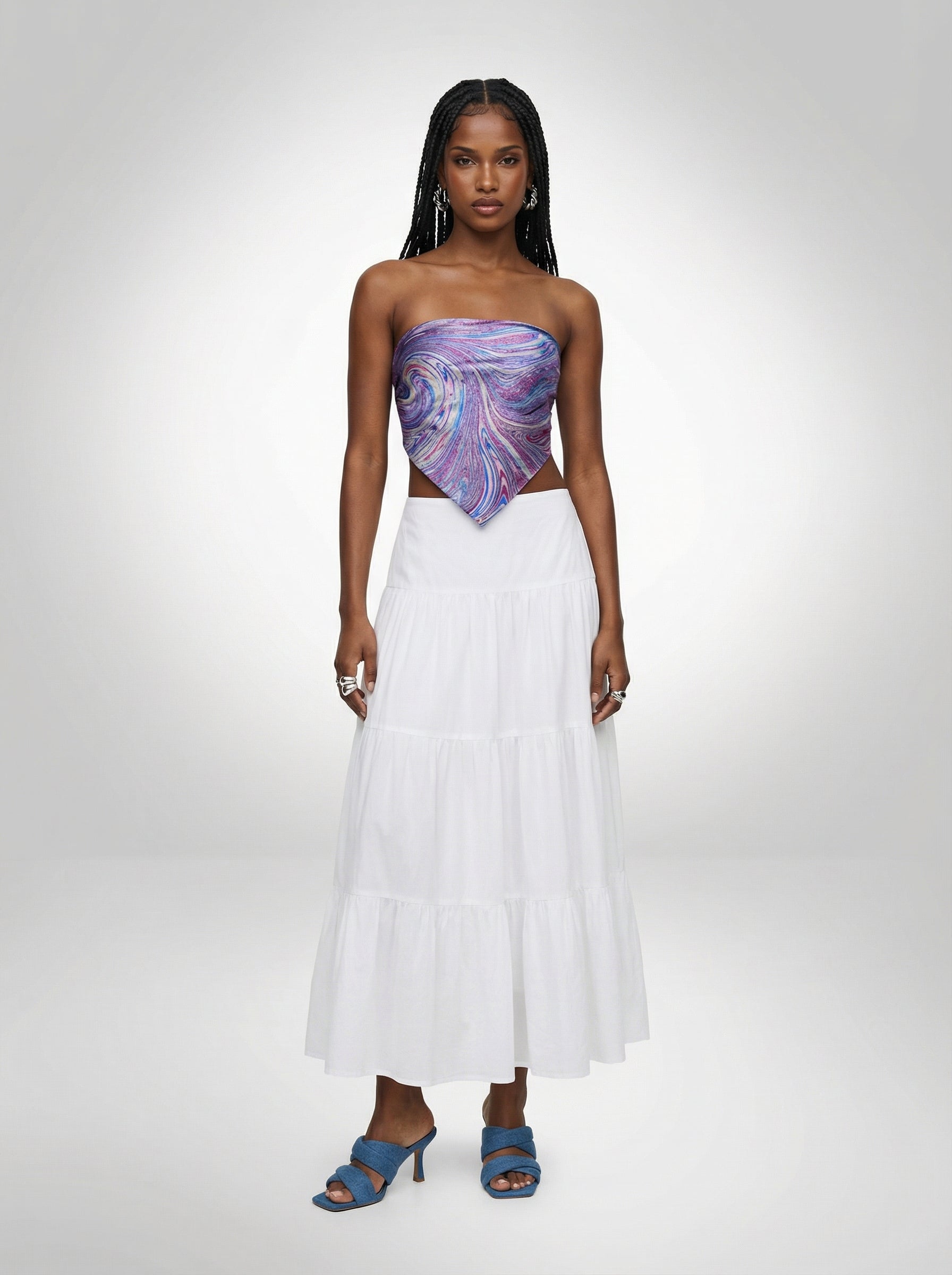 Pair the purple static scarf top with a white maxi skirt and denim sandals for a subtle pop of color that complements the purple, finished with silver jewelry.