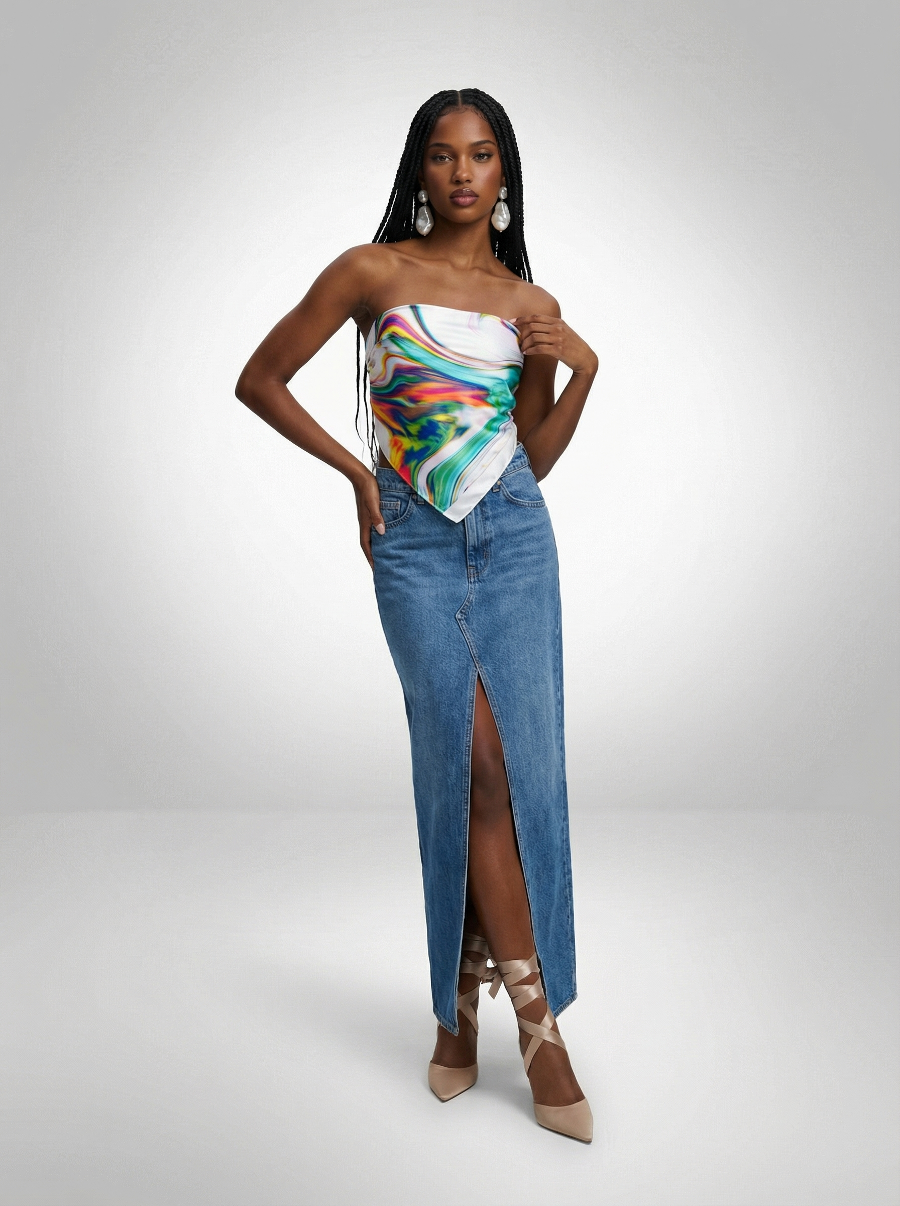 For a more feminine, elevated style, wear it with a maxi denim skirt, pearl statement earrings, and wrap-around heels.