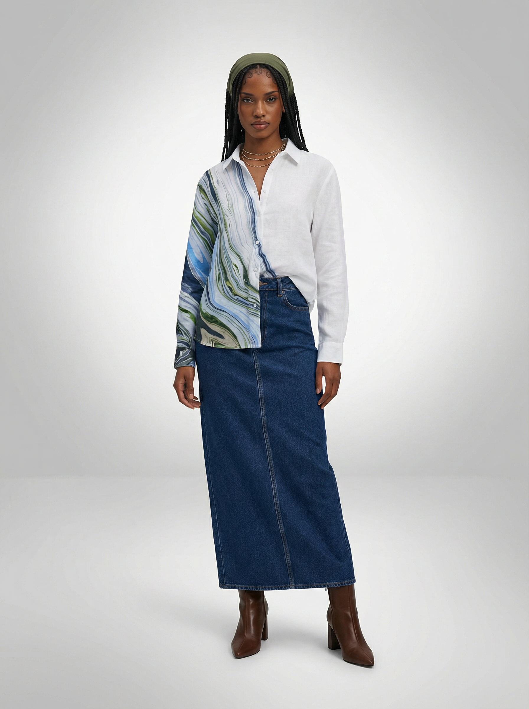 For Her: Style the linen shirt with a maxi denim skirt, brown short boots, and an olive-colored head band for an easy, grounded look with a natural color balance.