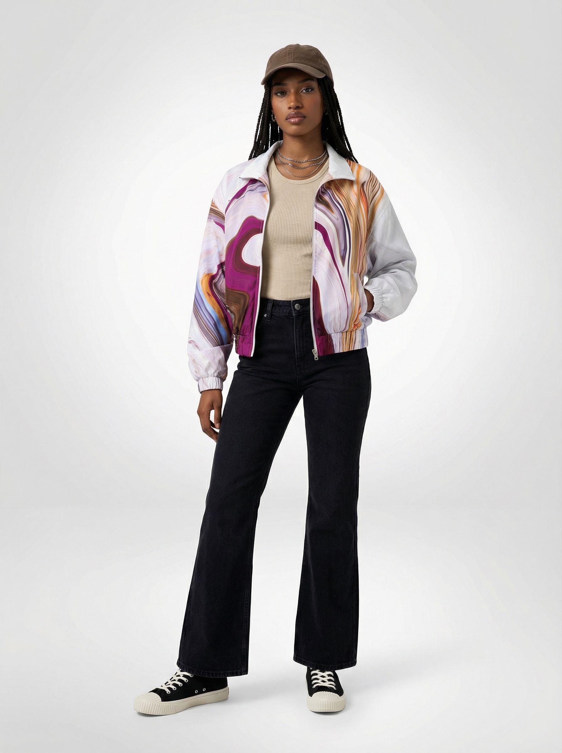 For Her: Style 'Hurricane Ophelia' windbreaker jacket with a beige or white tank top for a clean base. Paired with flared jeans or stretchy straight-leg pants for comfort and movement. Finished with classic Converse sneakers and a beige or brown cap for a relaxed, everyday streetwear look.