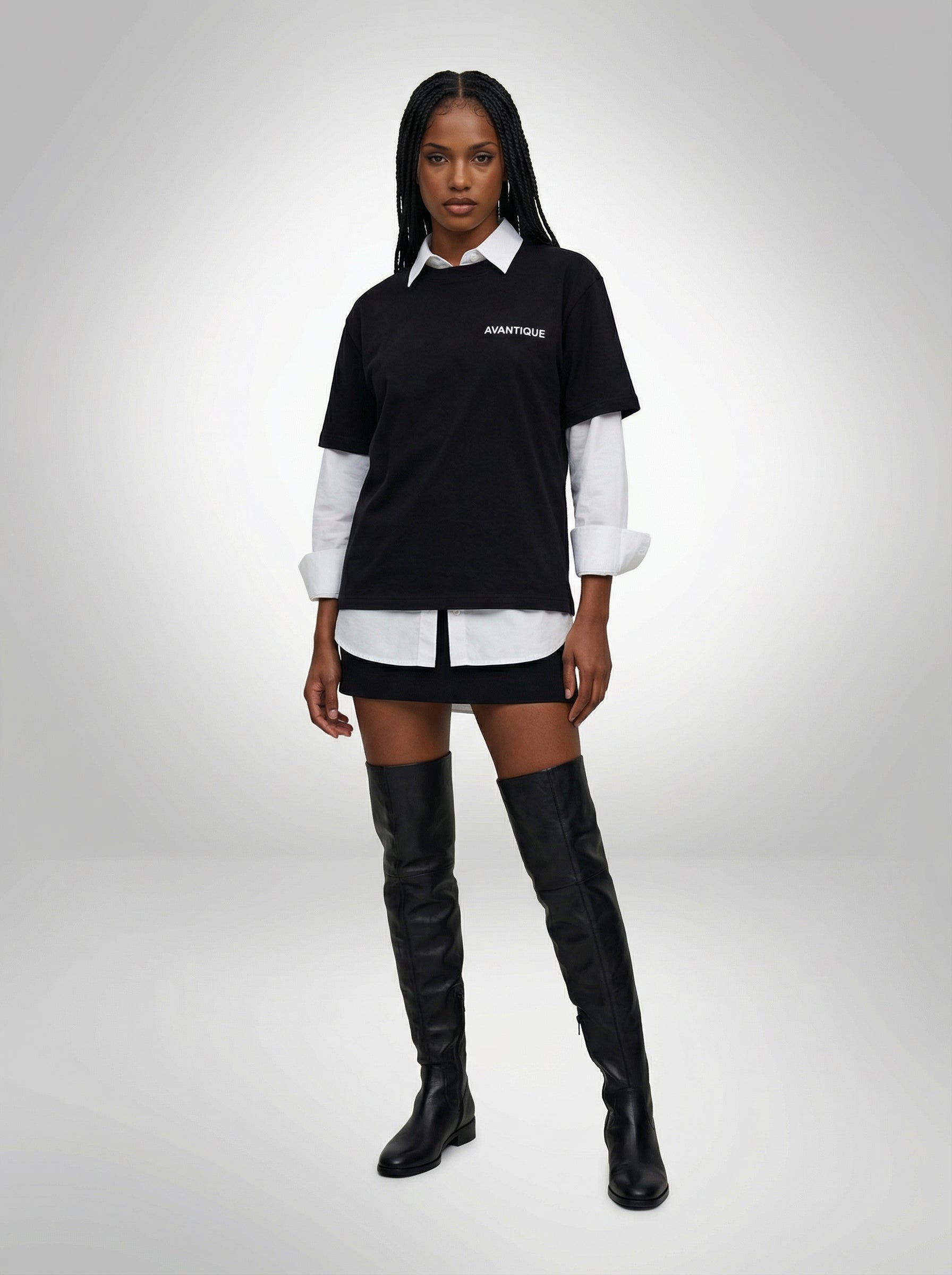 For Her: Layer the black T-shirt over a white button-down, paired with a mini skirt or shorts and long black boots for a clean, confident layered look.