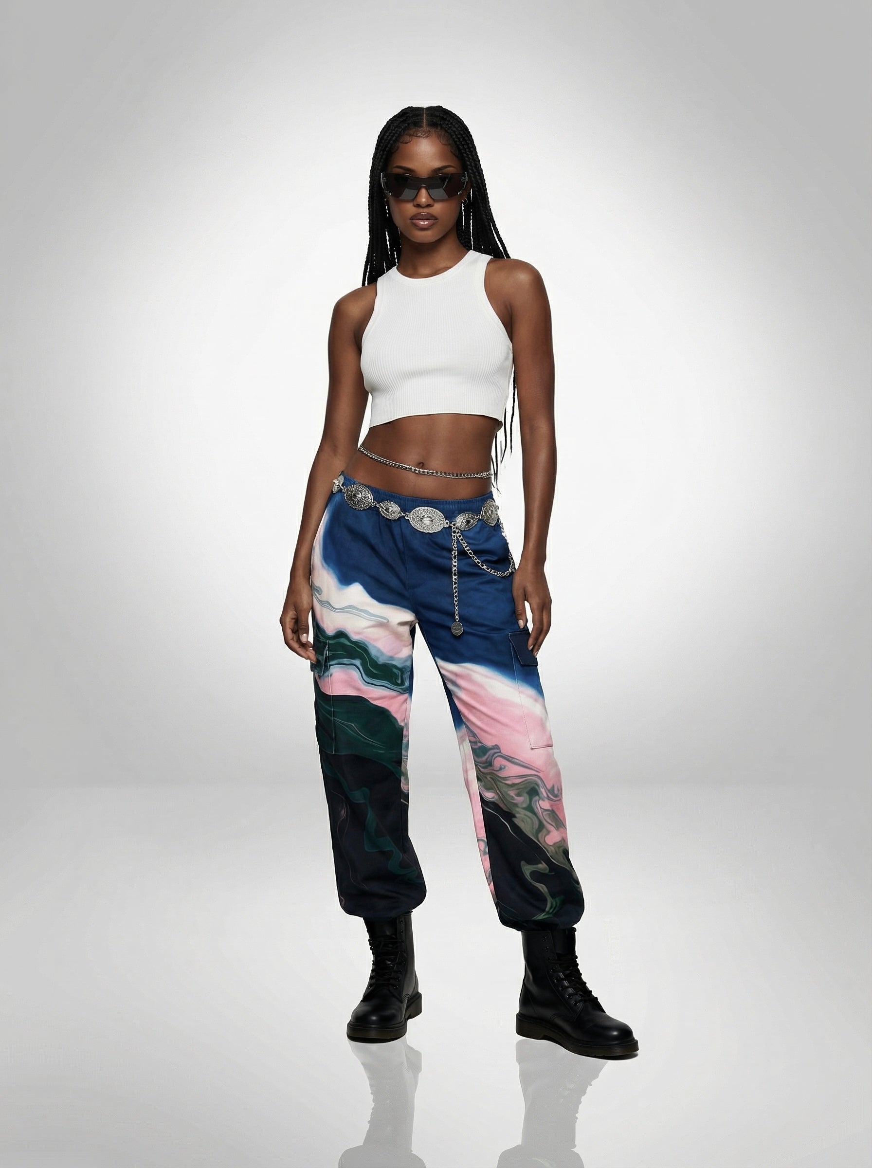 For Her: Style the cargo pants with a cropped white shirt, a silver waist belt, black Dr. Martens boots, and glasses for a sharp, modern look.
