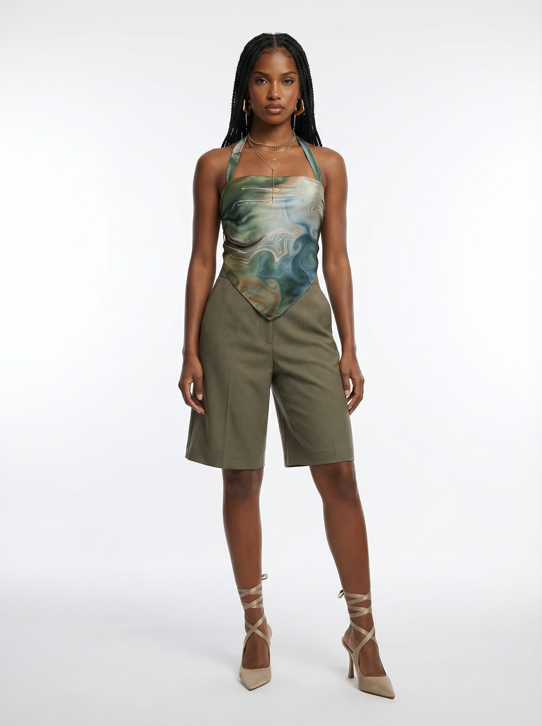 For Her: Style the scarf top with knee-length cappuccino-colored tailored shorts, matching cappuccino pointy wrap-around heels, and golden jewelry for a polished, elevated look.