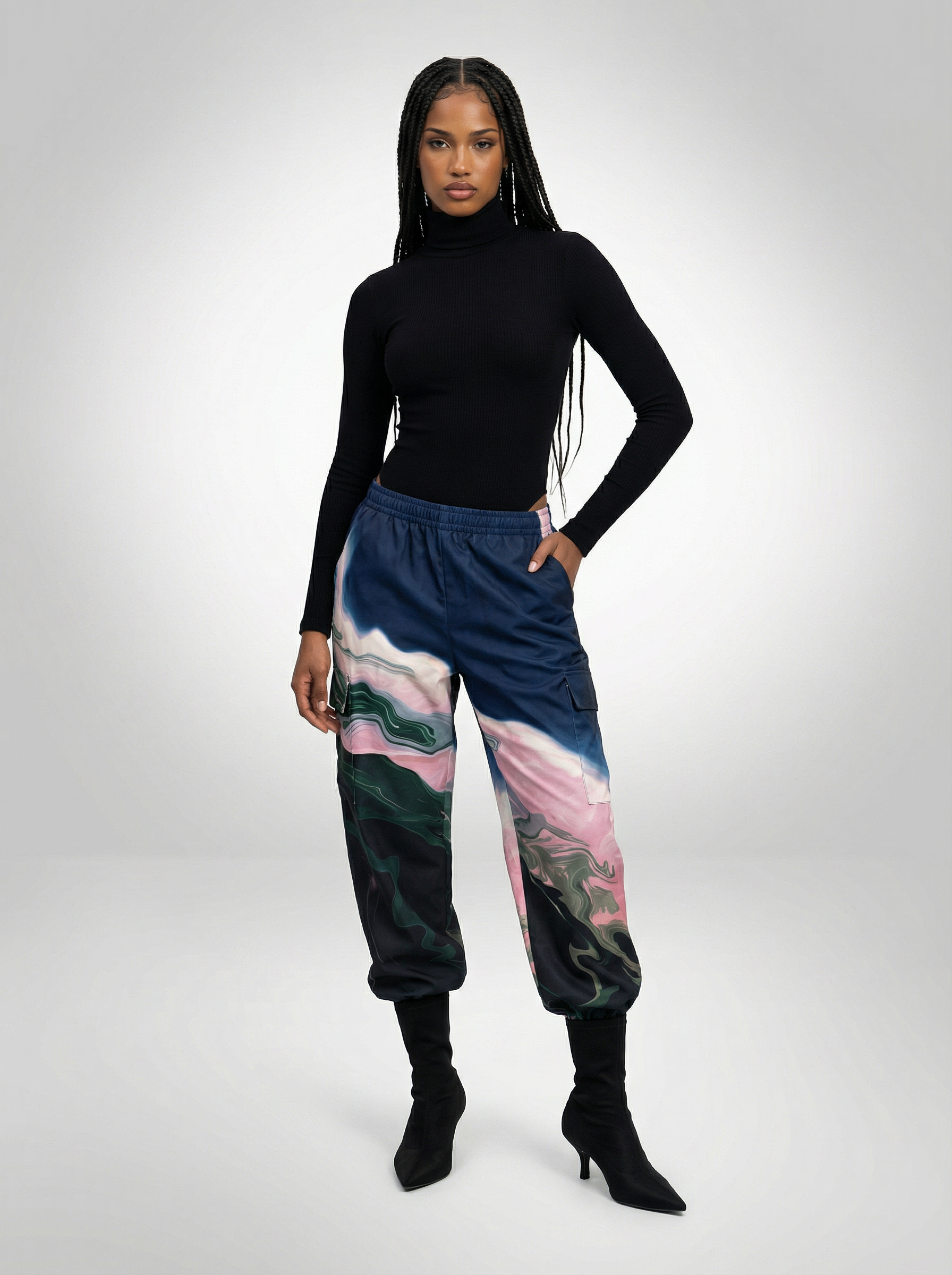 For Her: Style our cargo pants, tightened at the ankles, with a long-sleeve black turtleneck bodysuit tucked in, and finish with black sock-style boots for a sleek, utilitarian look.