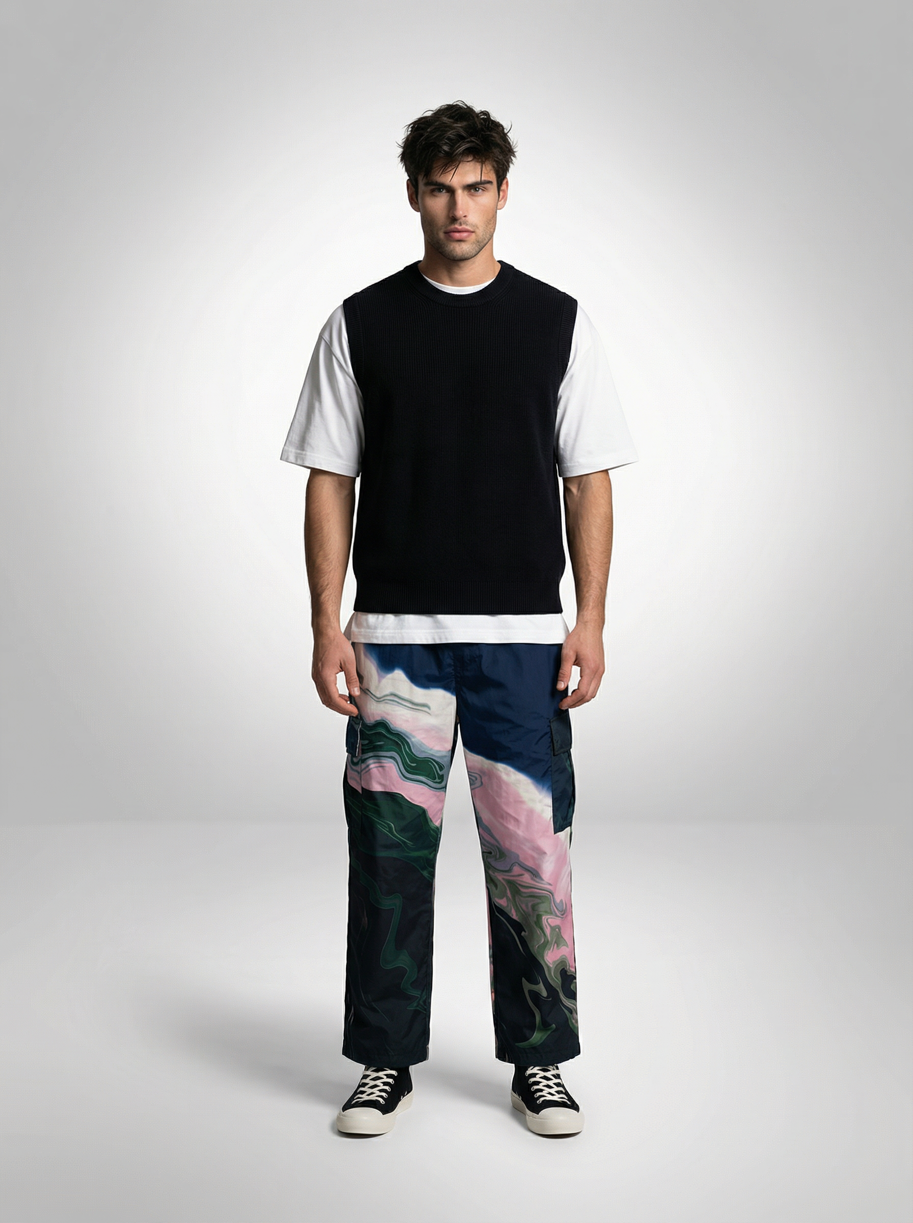 For Him: Style the cargo pants with a white T-shirt layered under a black sleeveless vest, paired with black Converse sneakers for a clean, effortless street look.