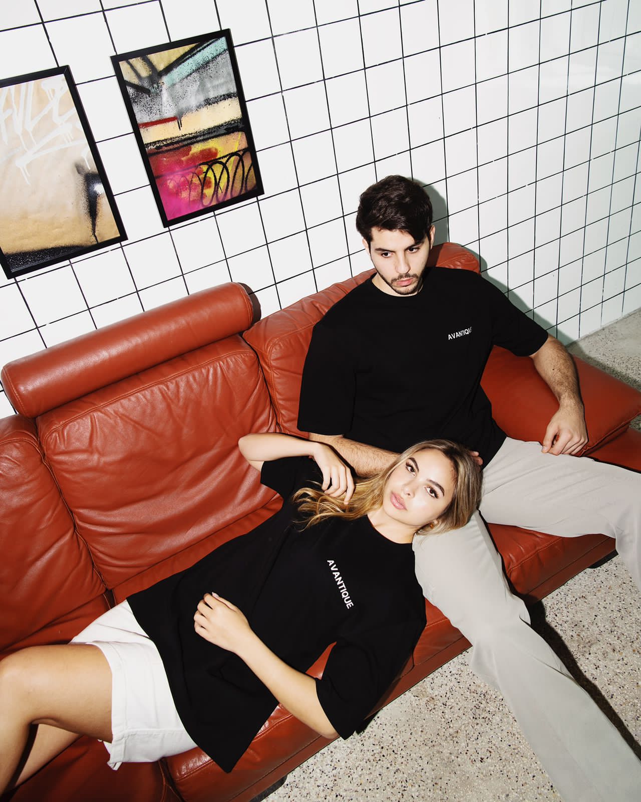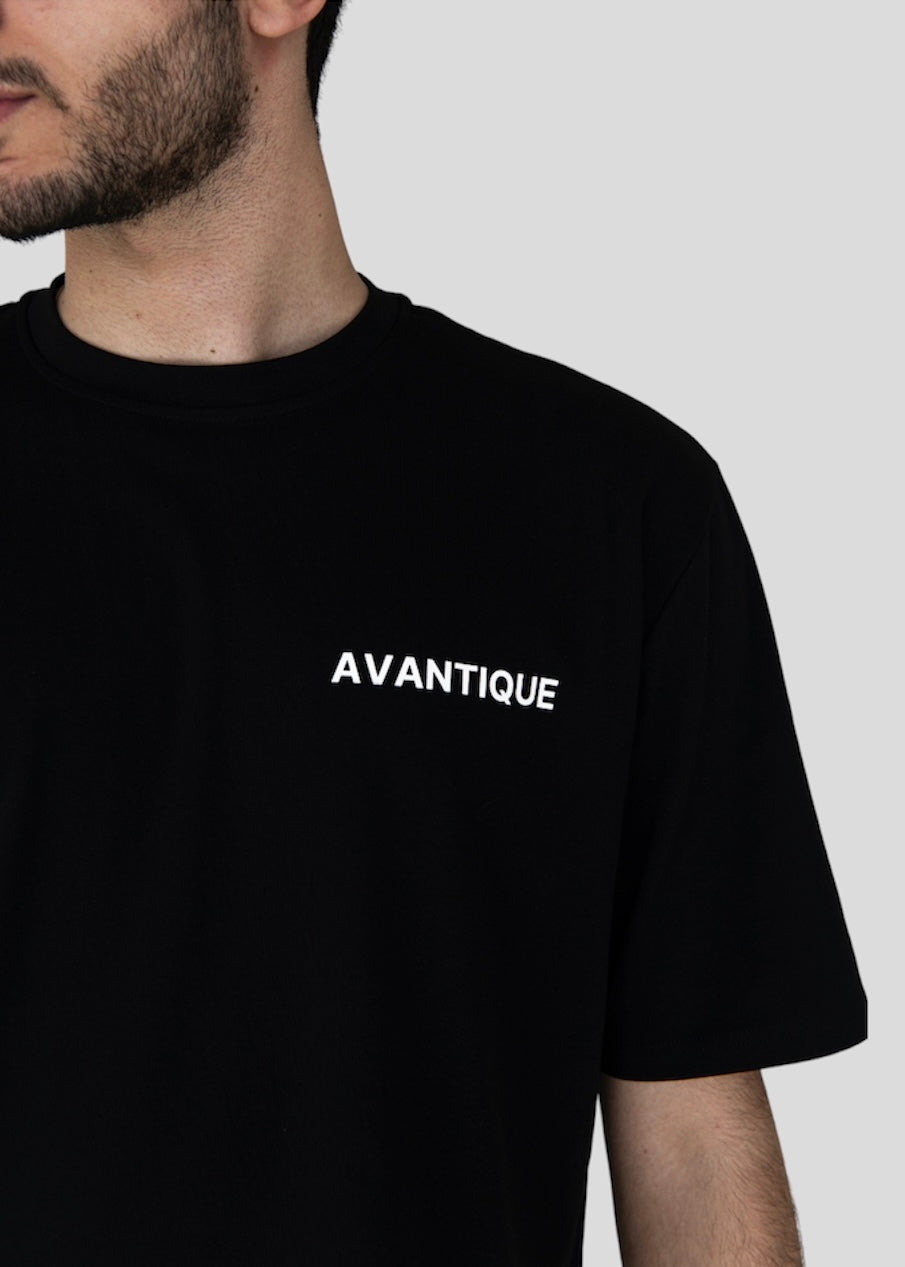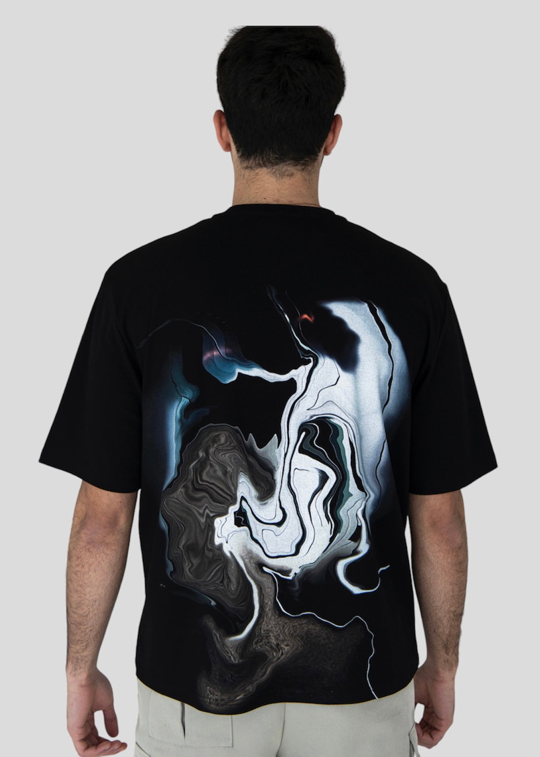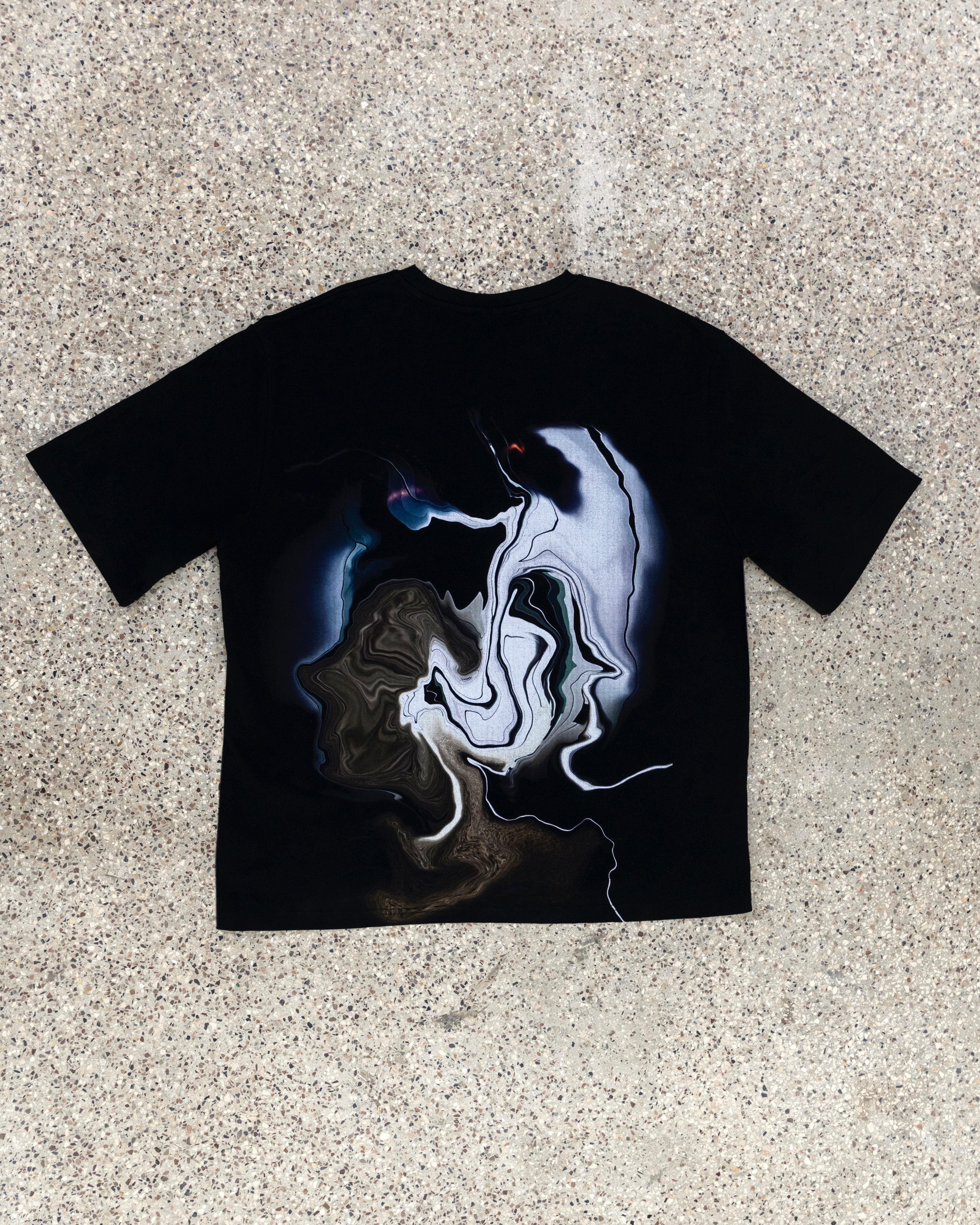 The Interlinked T-shirt is an oversized unisex piece crafted for comfort, featuring an abstract pattern of two interlinked profiles on the back. Rendered in shades of white, grey, blue, and brown, the design explores connection between people, identities, and perspectives.