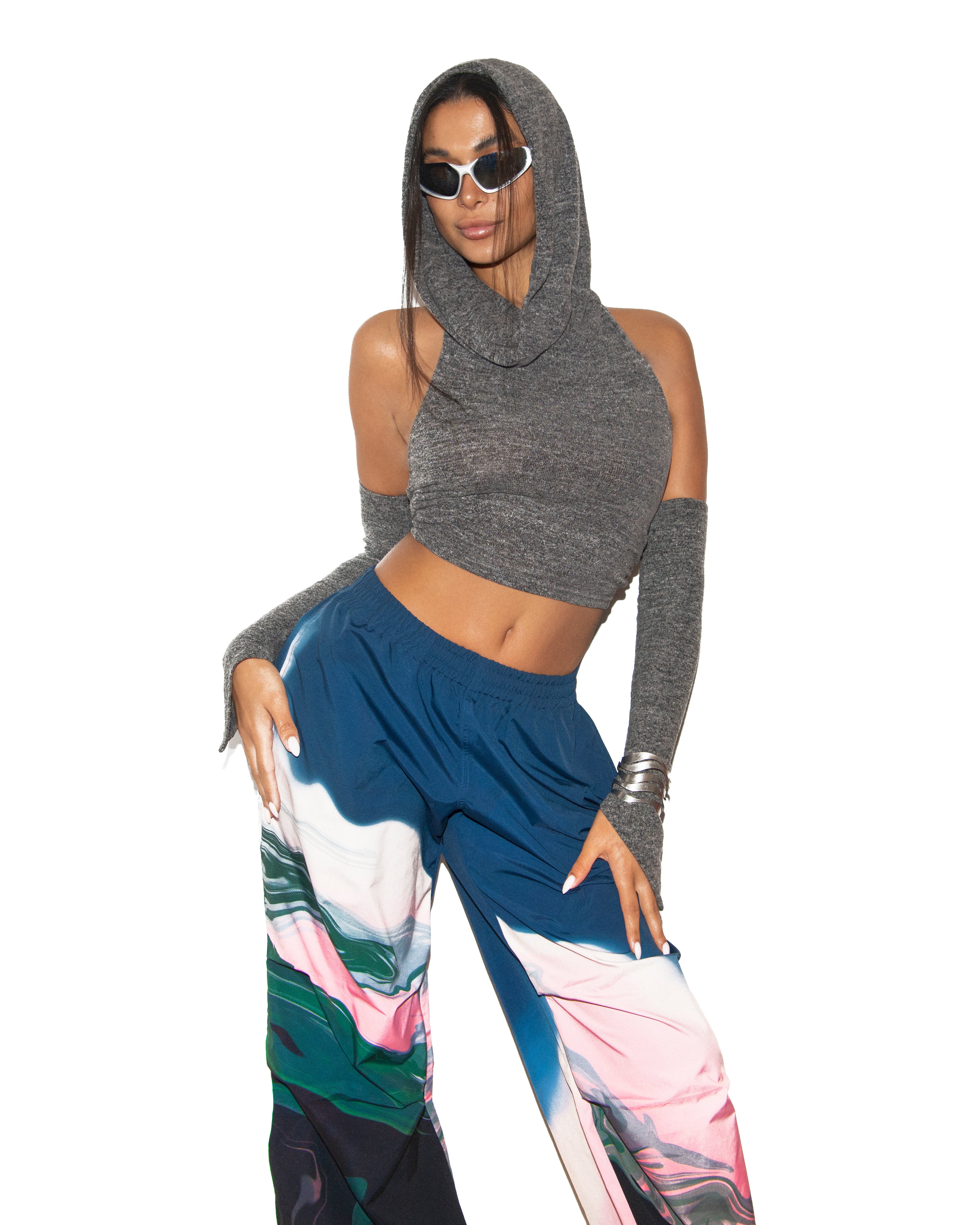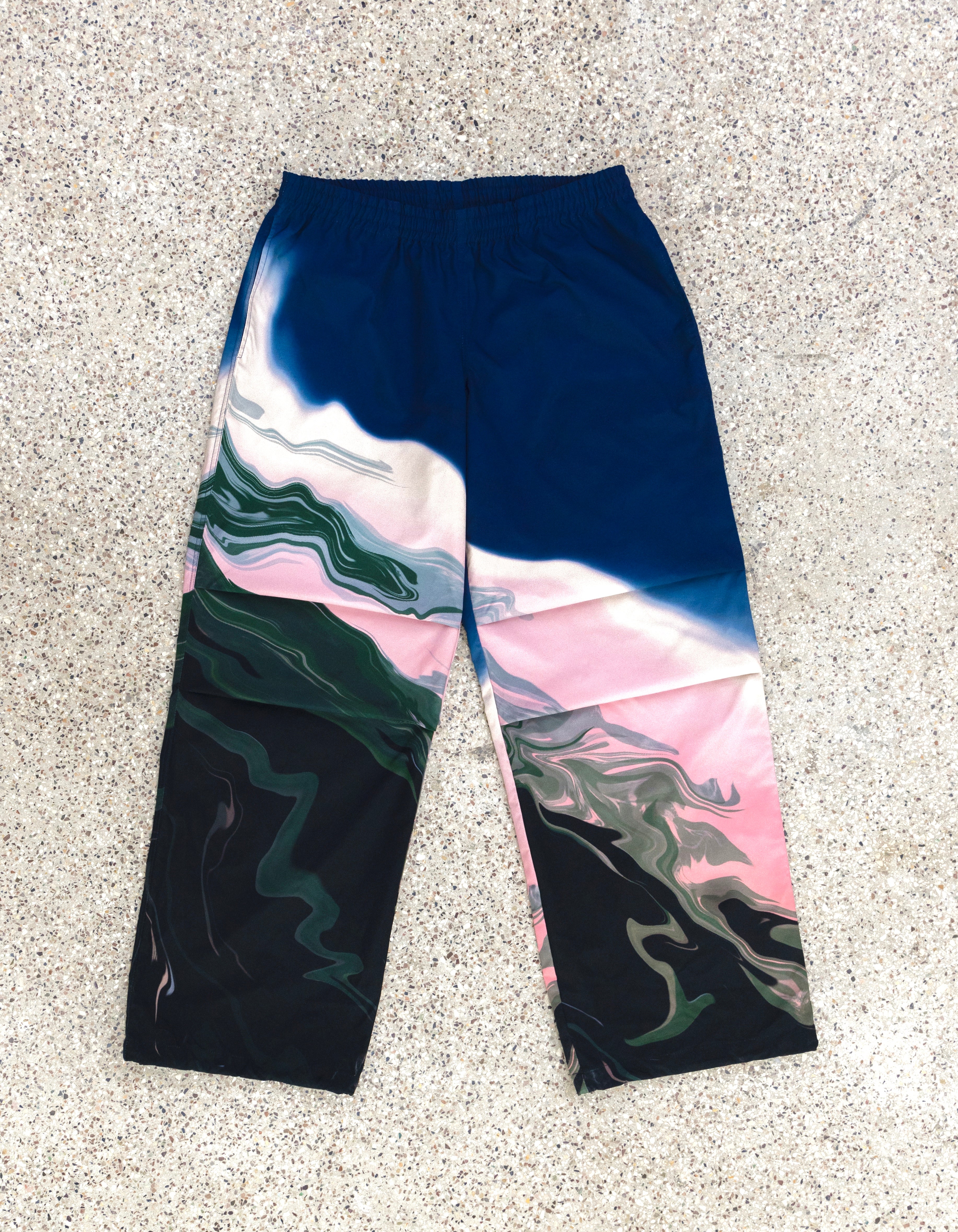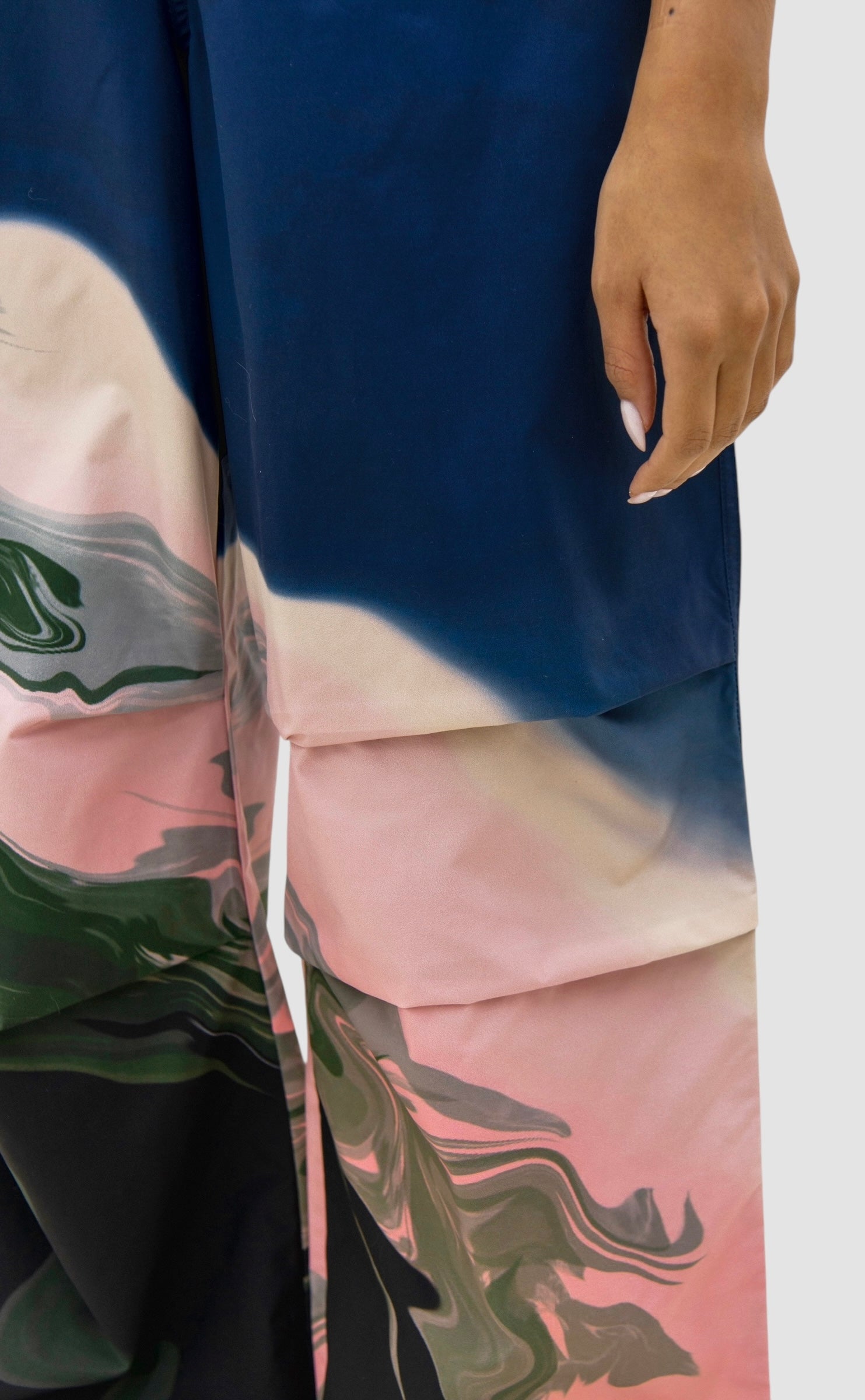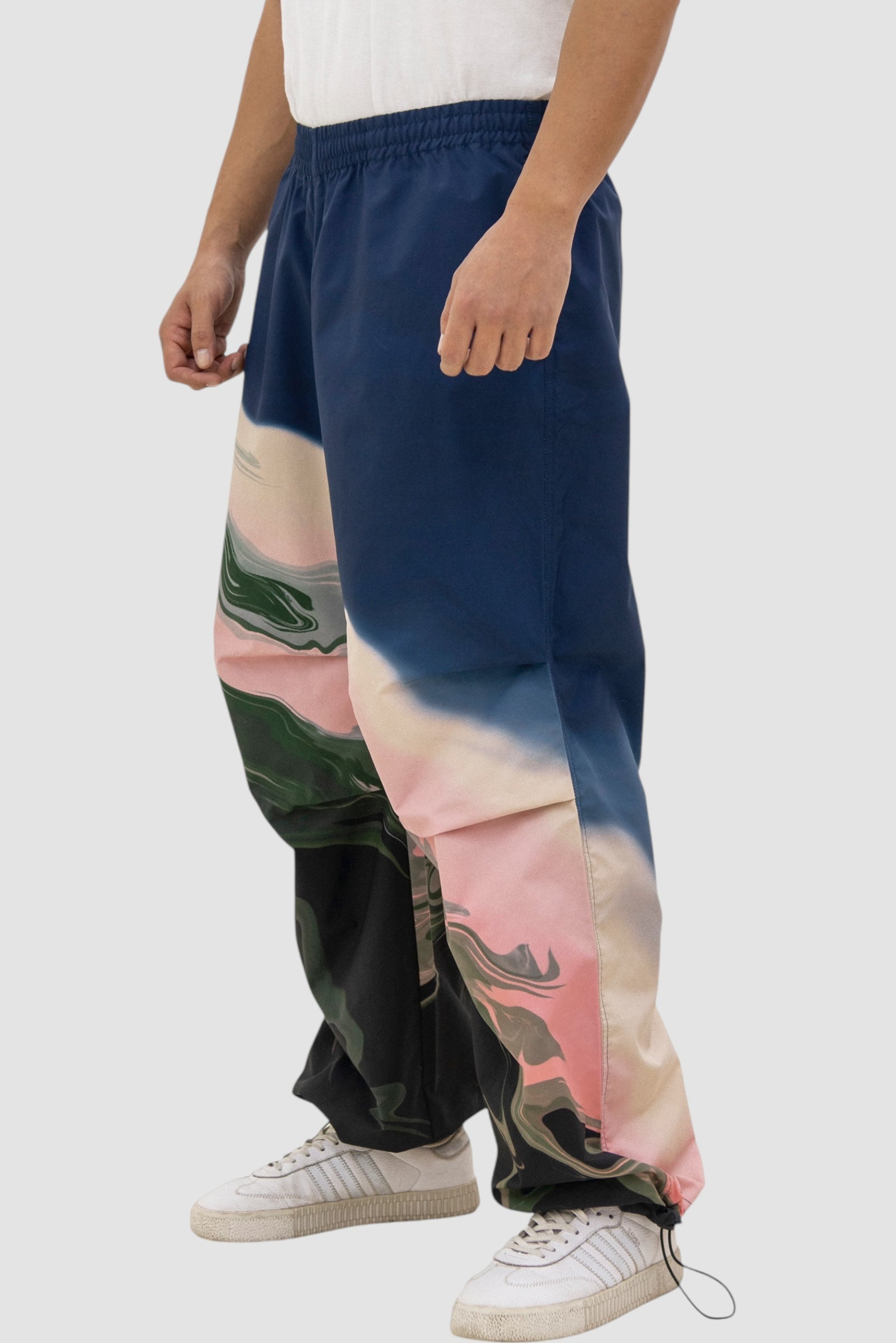 The Tidal Waves Cargo Pants are a unisex staple featuring an all-over wave-inspired pattern in navy, pink, white, and green bringing color and energy to any look. Designed with movement in mind, they offer a relaxed fit, functional pockets, and adjustable drawstrings at the waist and ankles for a customizable fit.