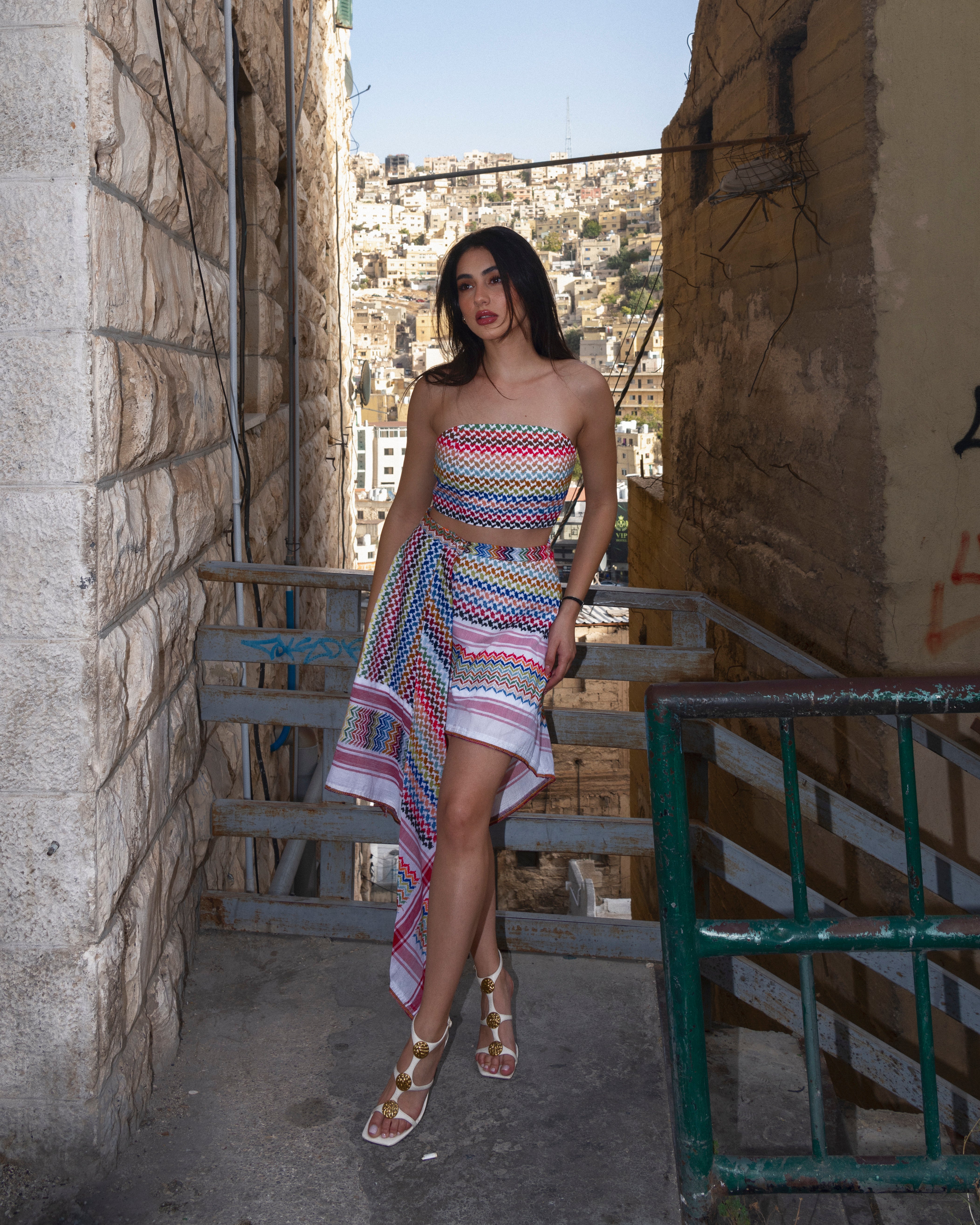 A bold fusion of heritage and individuality. This asymmetrical set reimagines the iconic Palestinian kuffiyeh, honoring deep-rooted culture with a contemporary twist. A tribute to third-culture identities: grounded in tradition, expressed in their own way.
